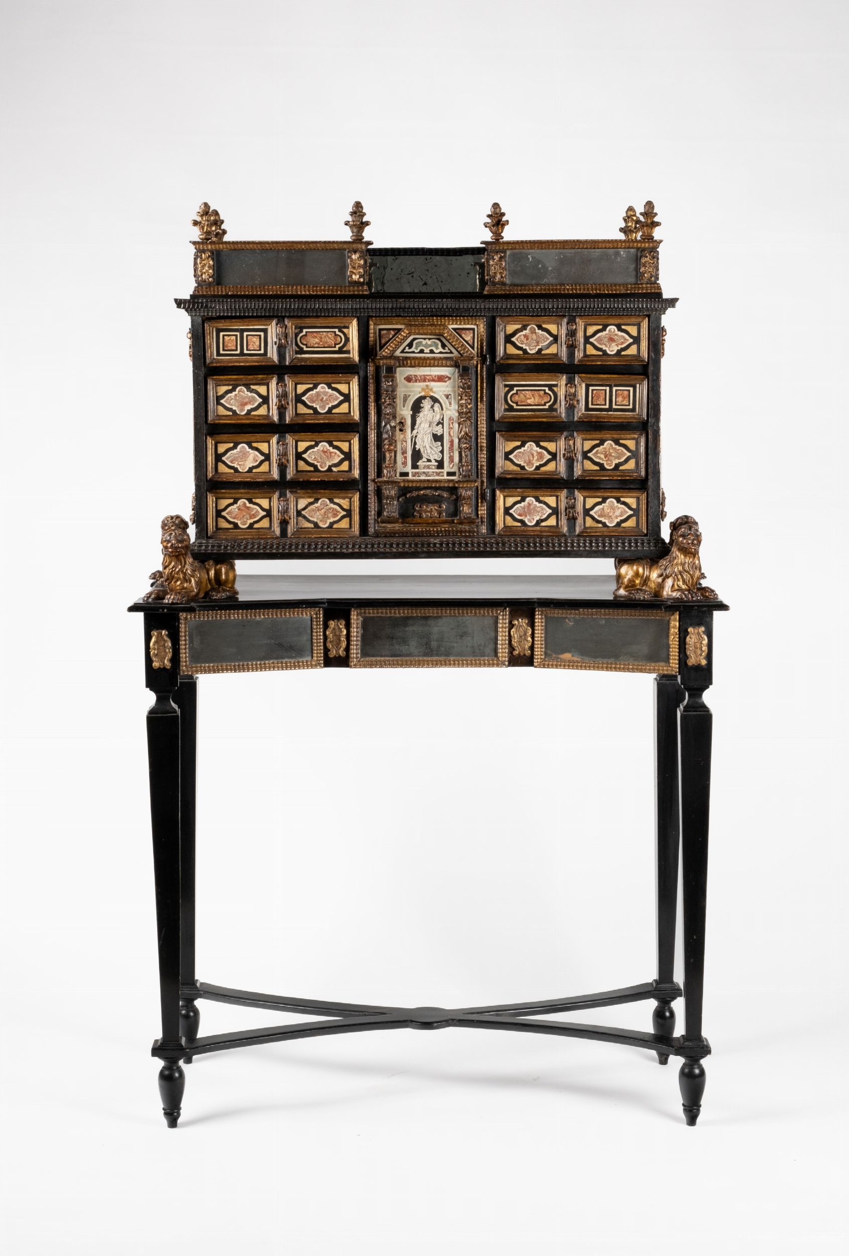 supporti leonini, fronte a otto tiretti e anta centrale, sormontato da ringhiera a specchio con palmette