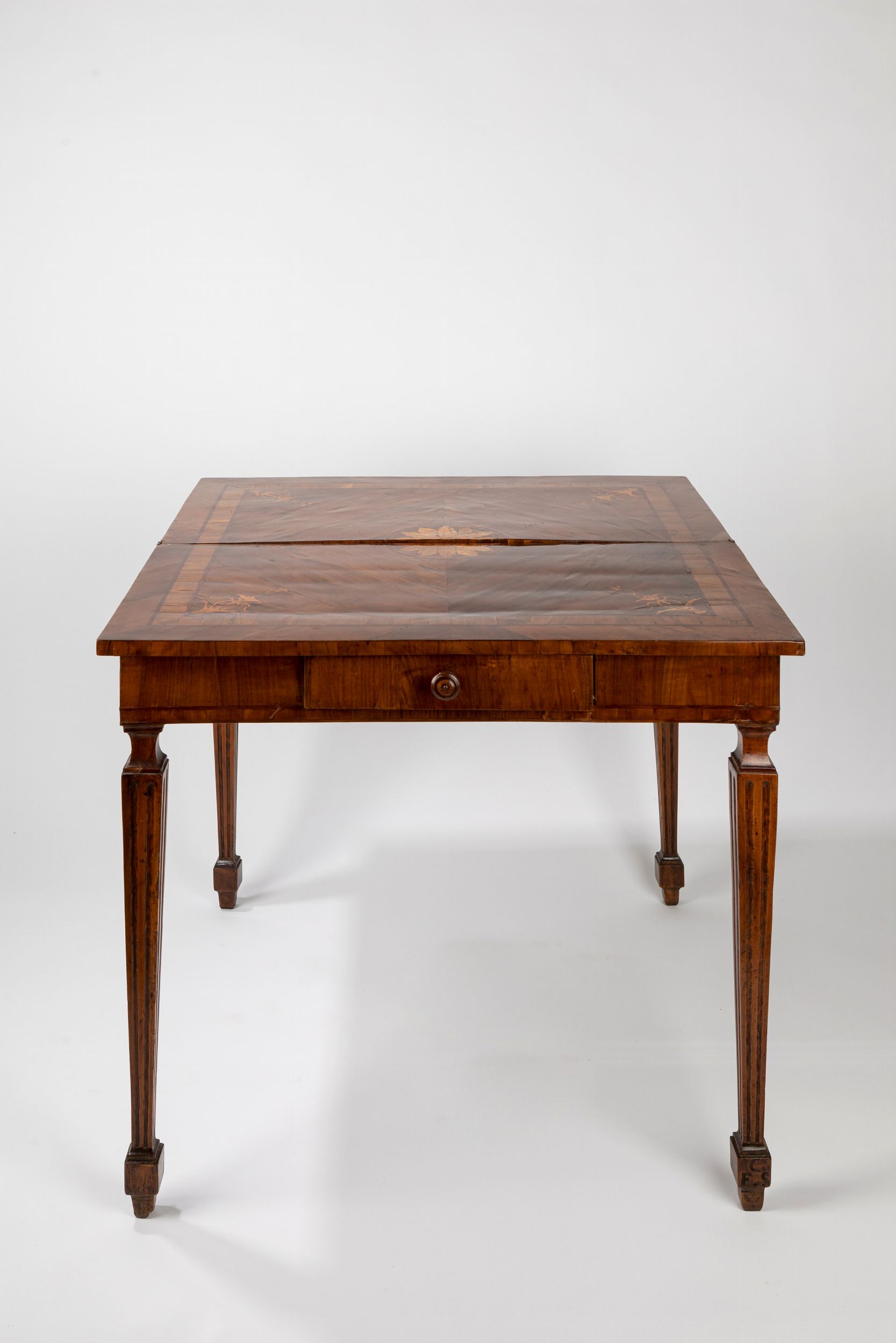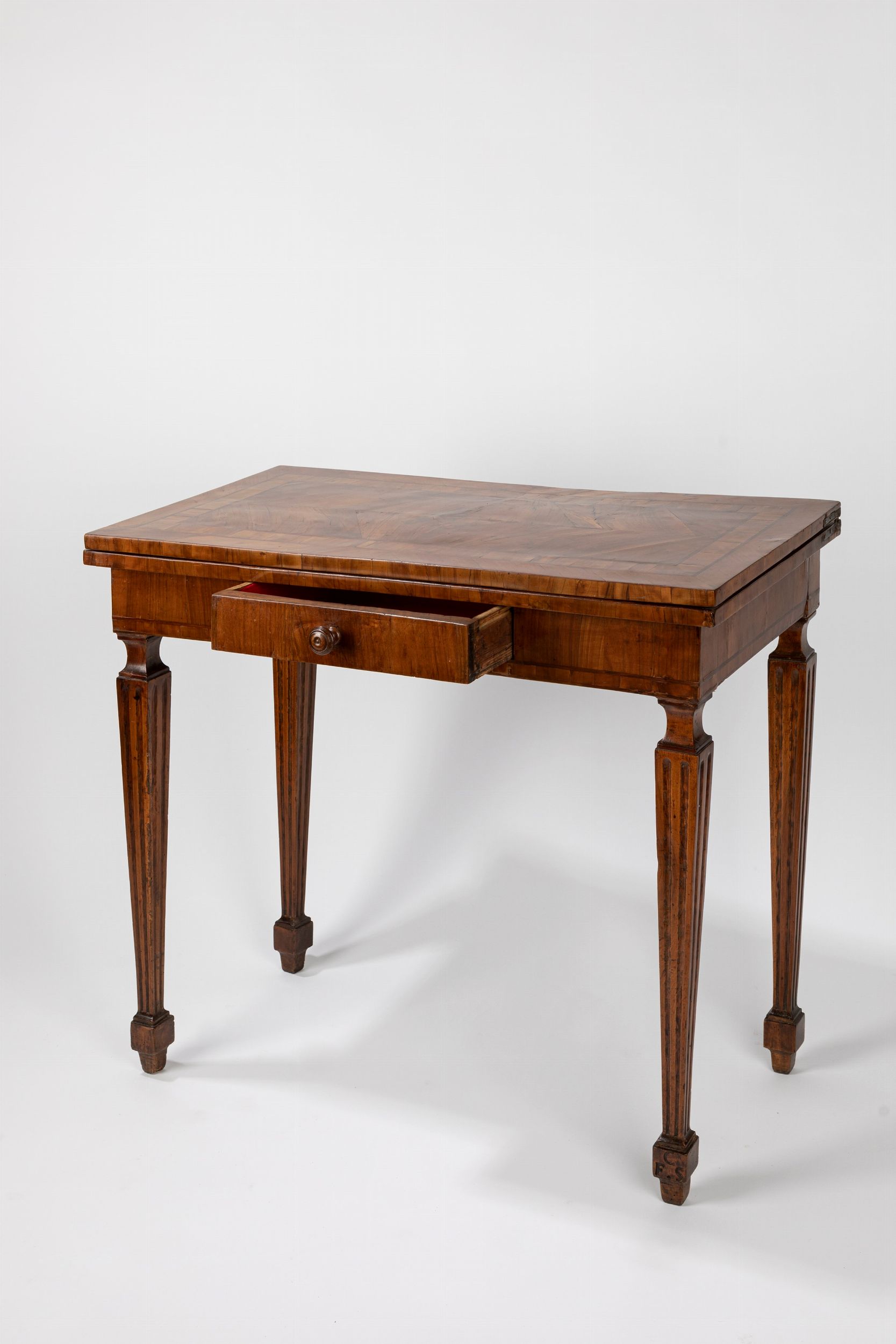 gambe scanalate troncopiramidali, un cassetto alla fascia, gambe posteriori a cancello, piano apribile