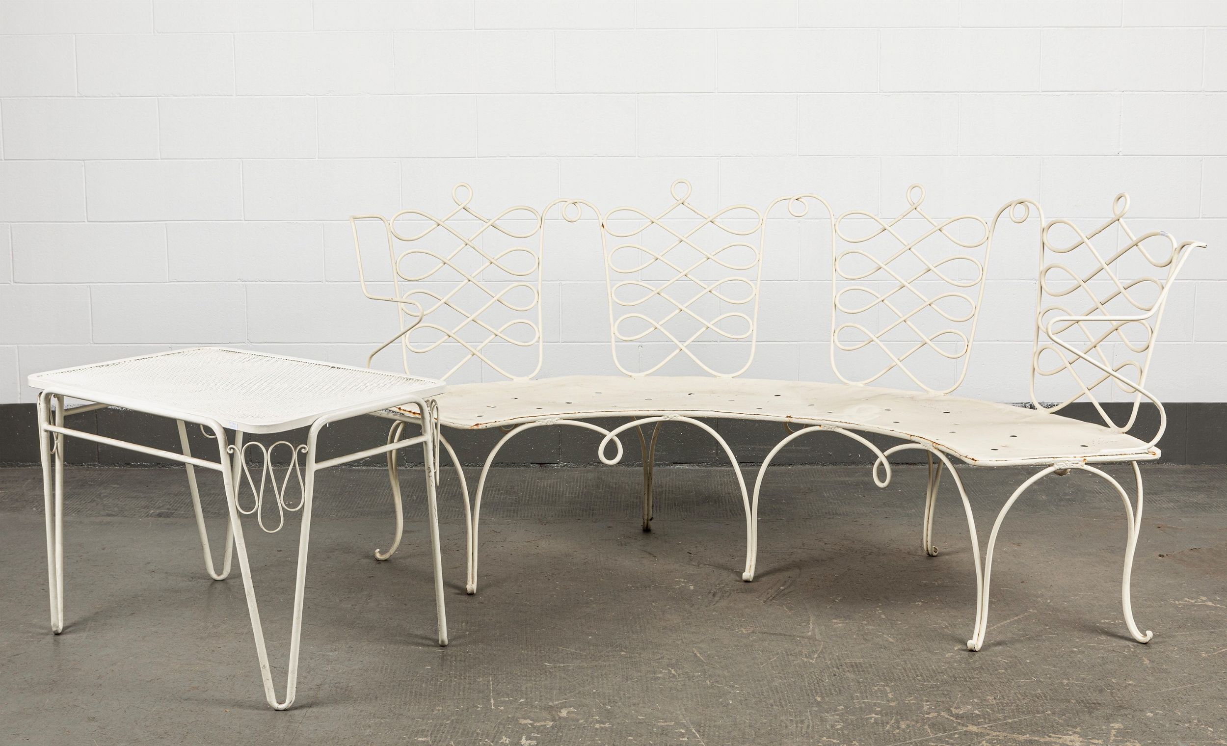 Un divano da giardino in ferro battuto bianco di forma semicircolare e un tavoli [..]