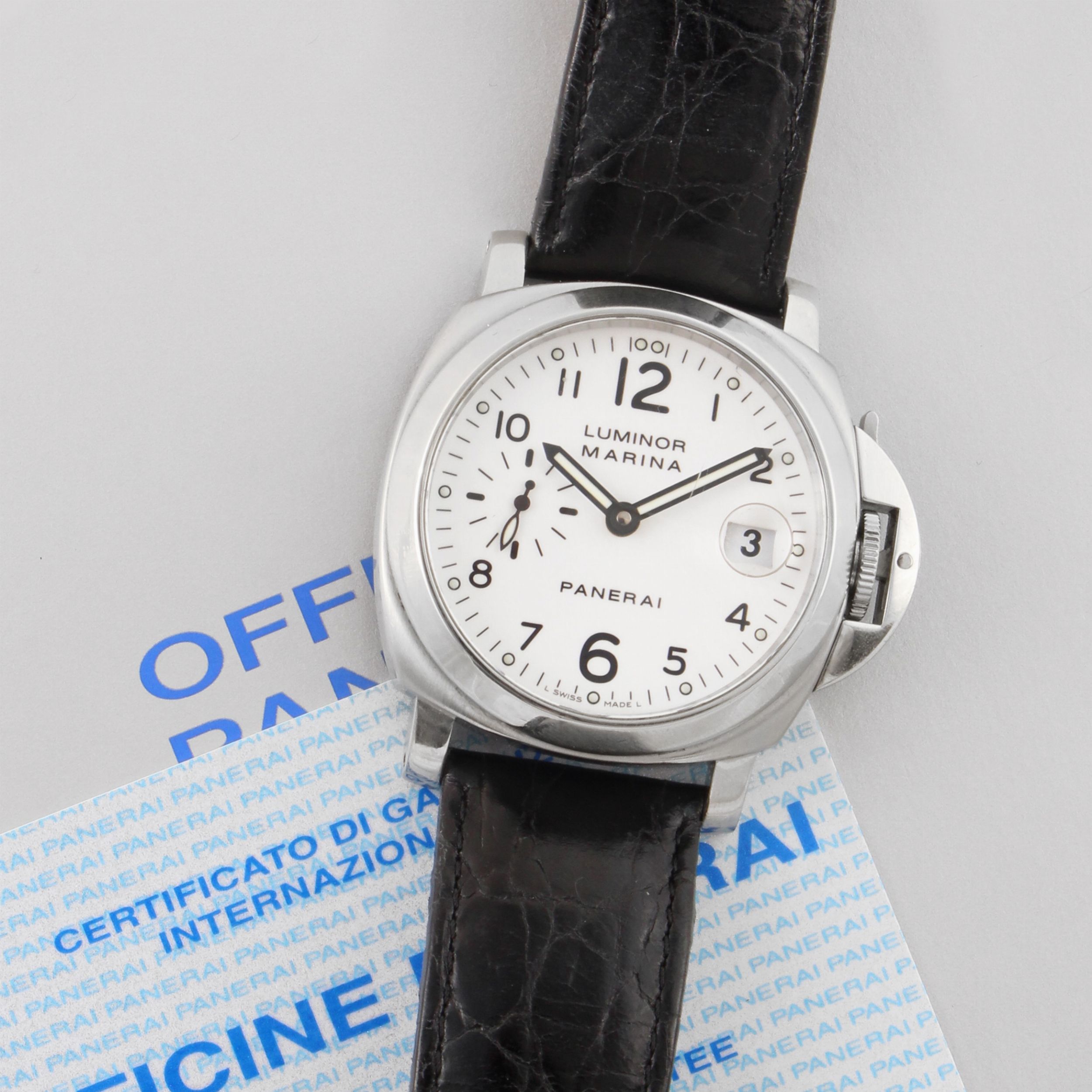 Quadrante: Bianco, numeri Arabi indici a bastone, secondi a ore 9, datario. Sferea bastone