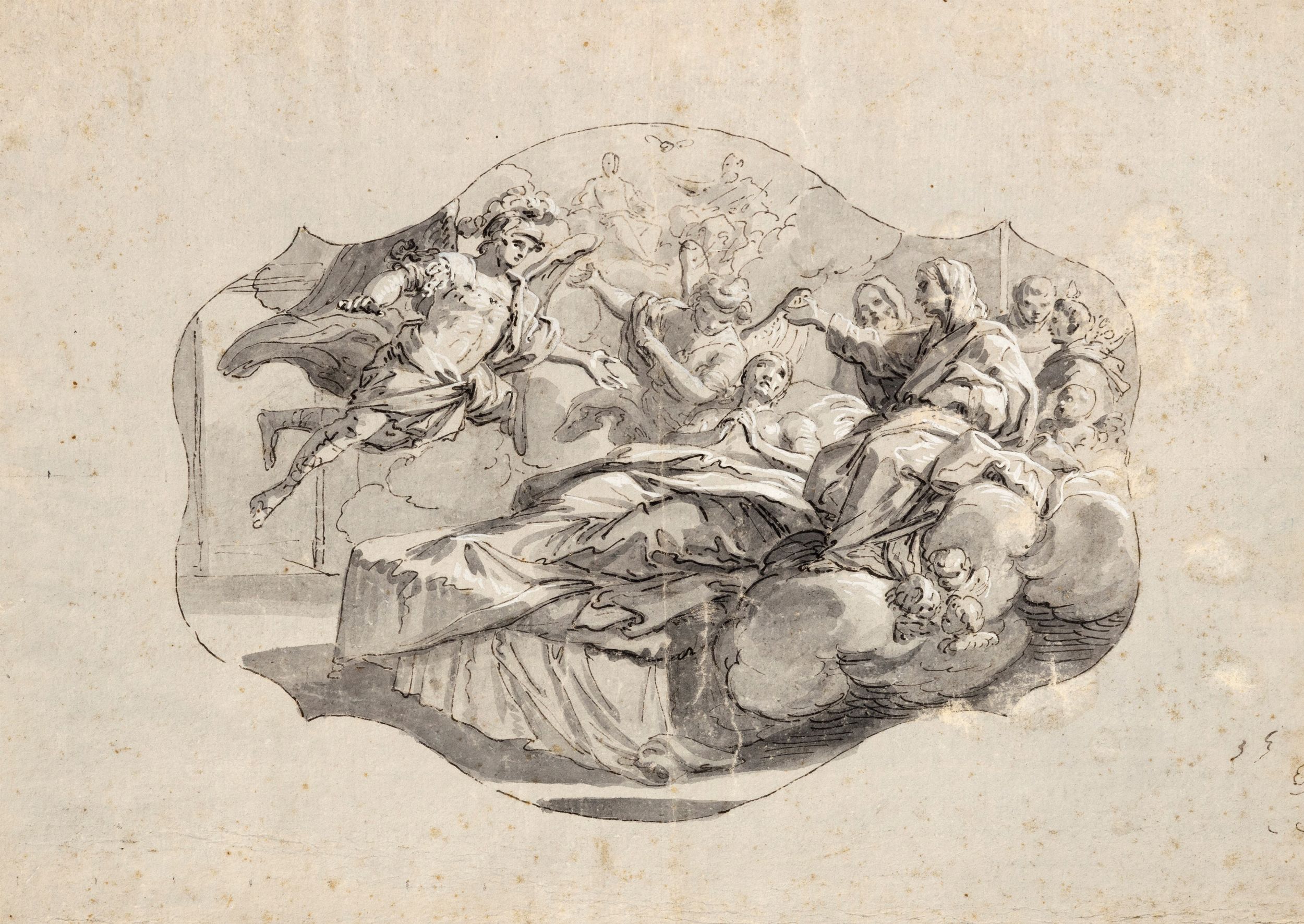 penna, inchiostro nero, acquerello grigio e biacca su carta (entro sagoma mistilinea), mm 292 x 405