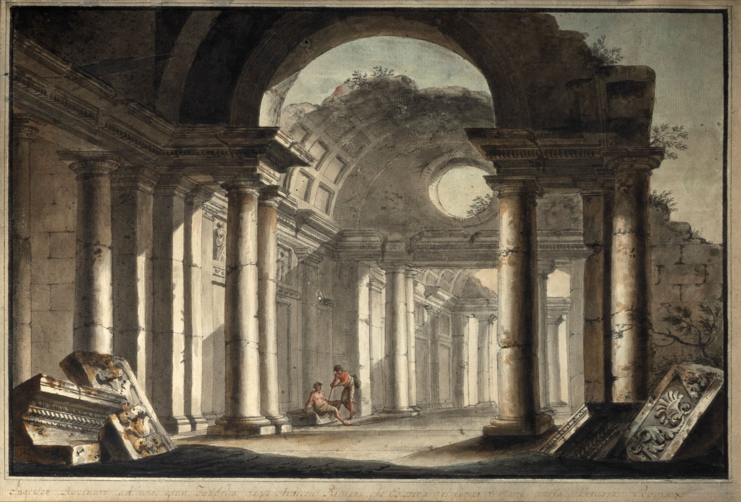 Cerchia di Hubert Robert (Parigi 1733 – 1808) : Capriccio architettonico con astanti  - Asta Dipinti e Disegni Antichi - Associazione Nazionale - Case d'Asta italiane
