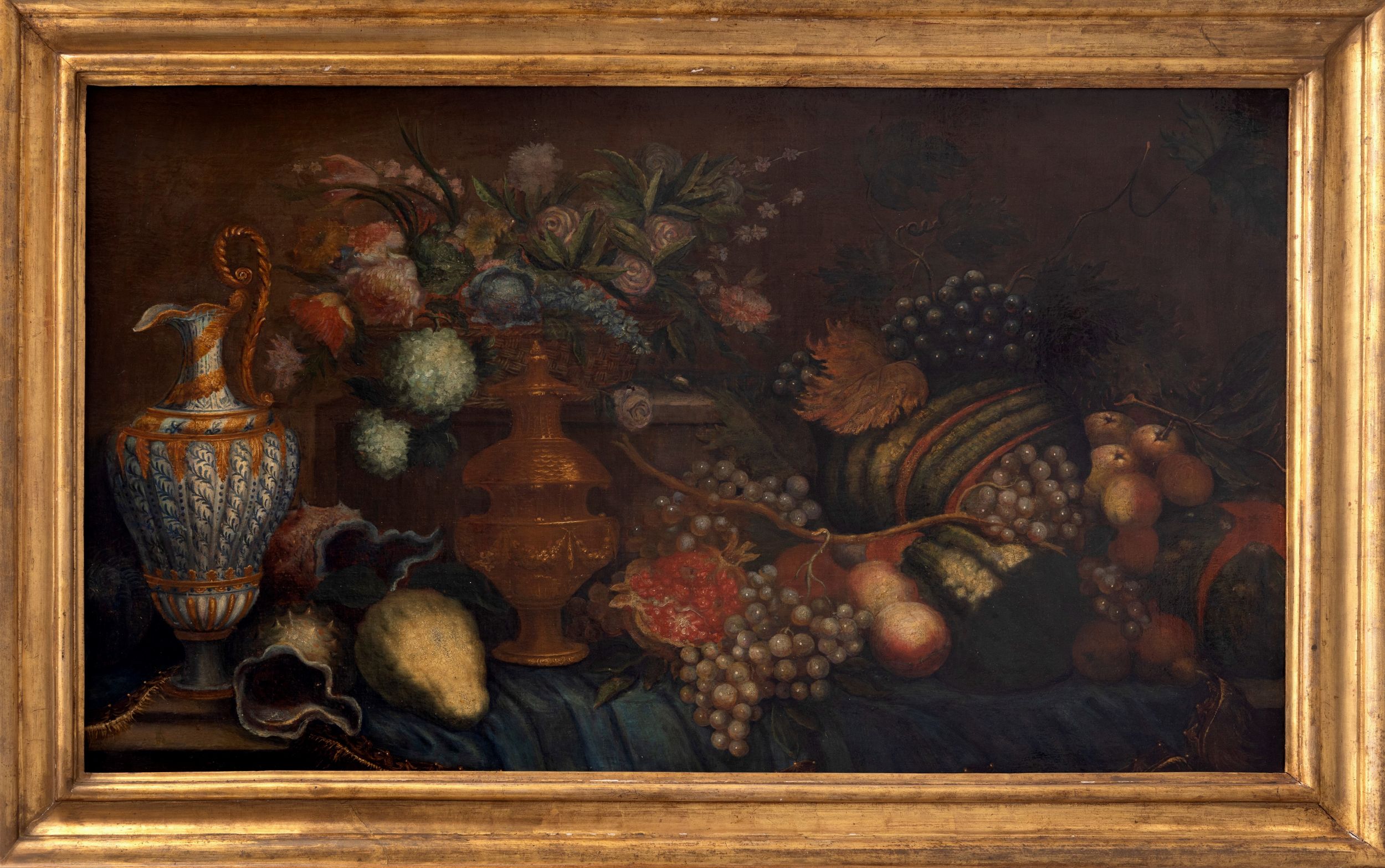 Frutta, fiori, vasellame e conchiglie su un tavolo