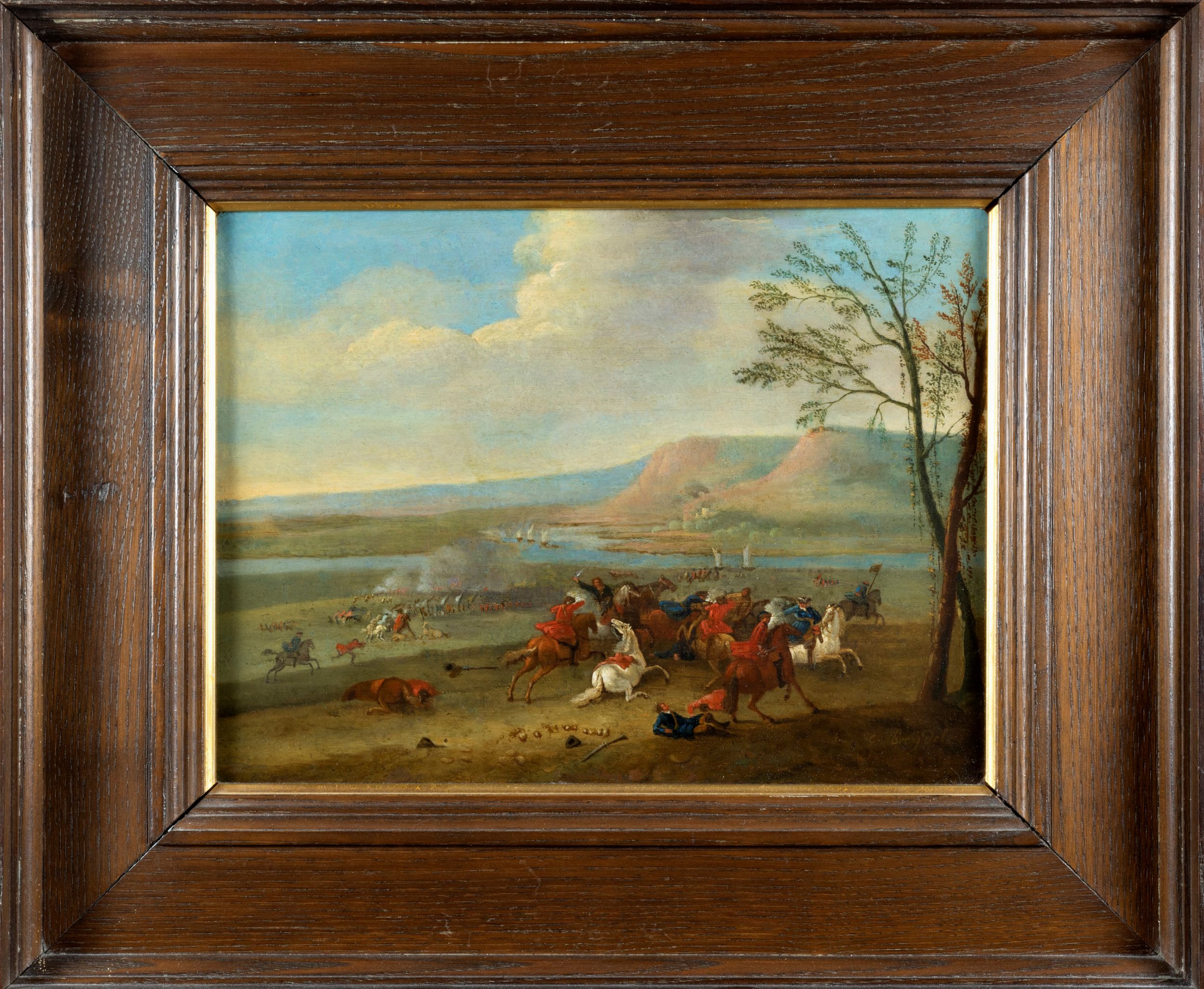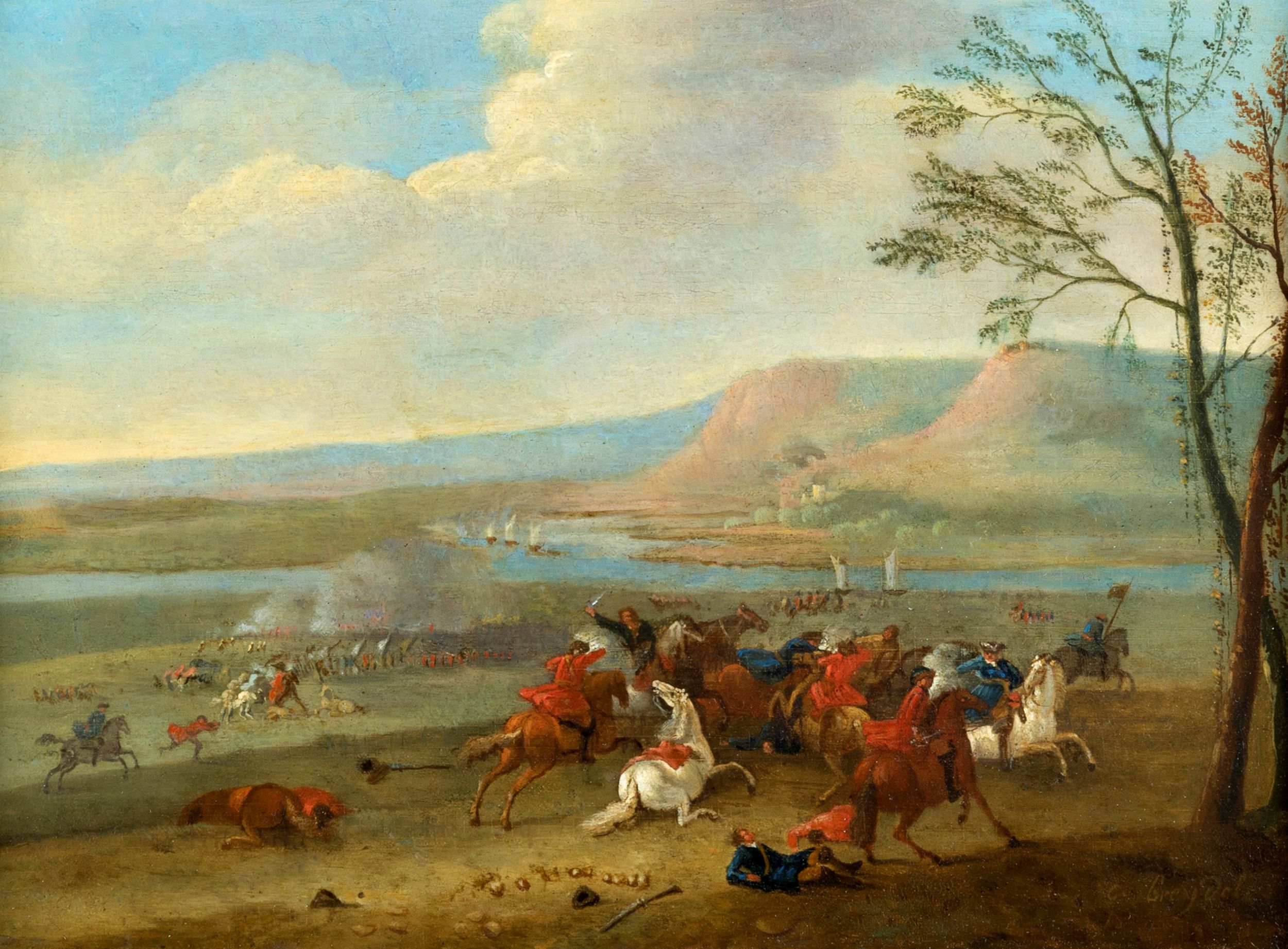 Paesaggio fluviale con scontro di cavalleria