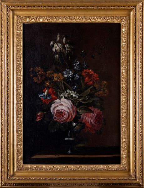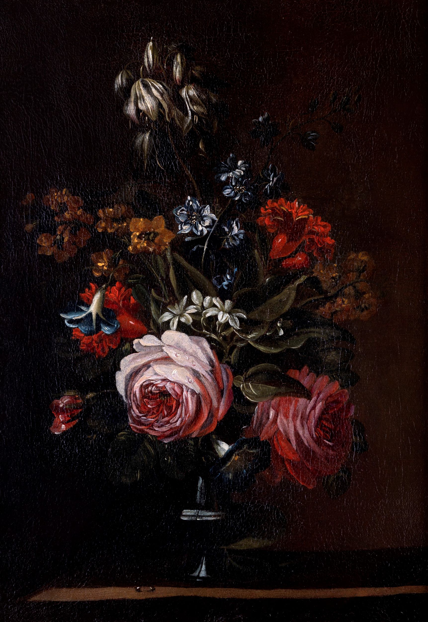Rose, narcisi, campanule e altri fiori in un vaso
