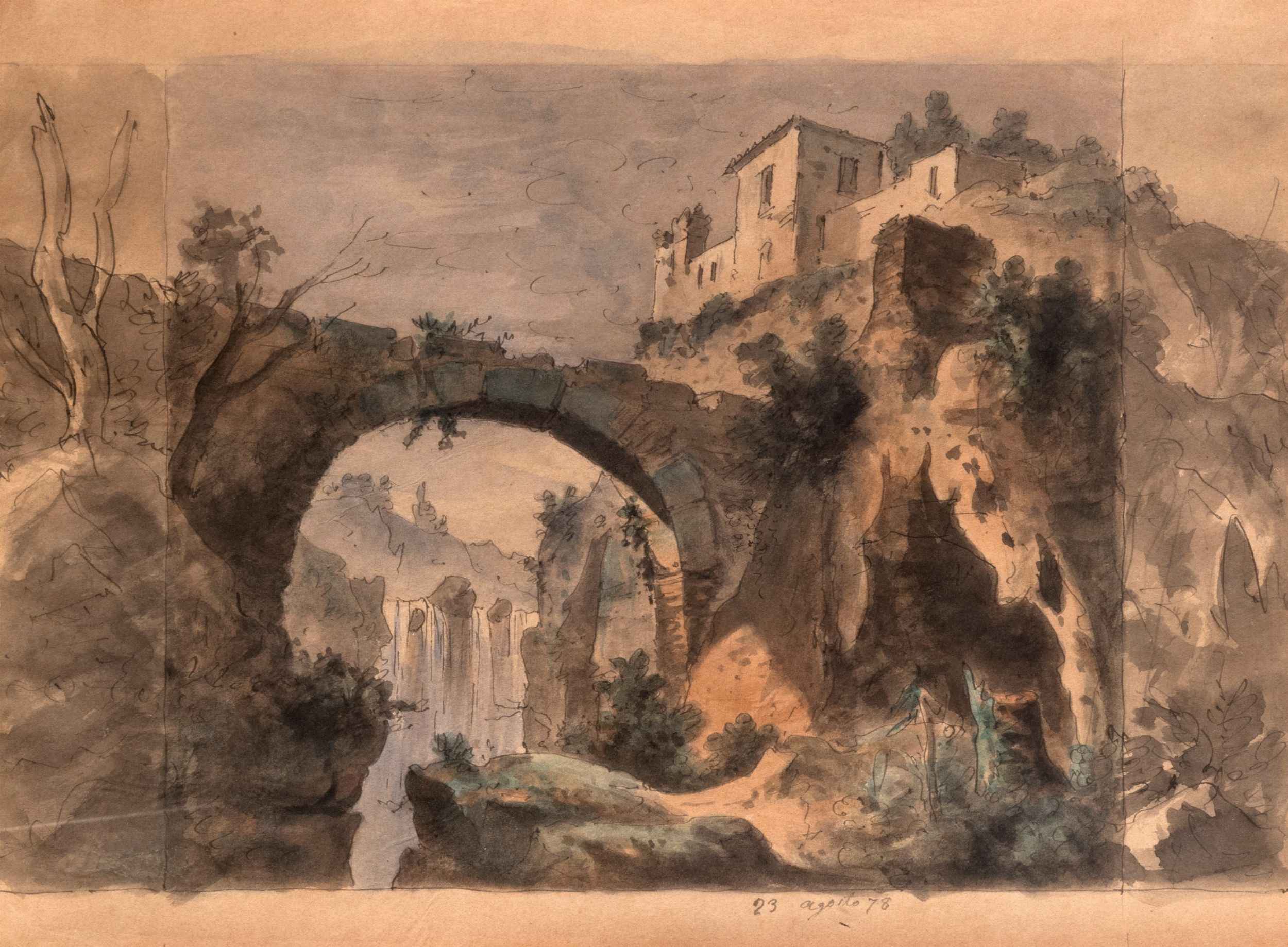 Veduta di borgo con sperone roccioso, cascata e ponte (Tivoli?)