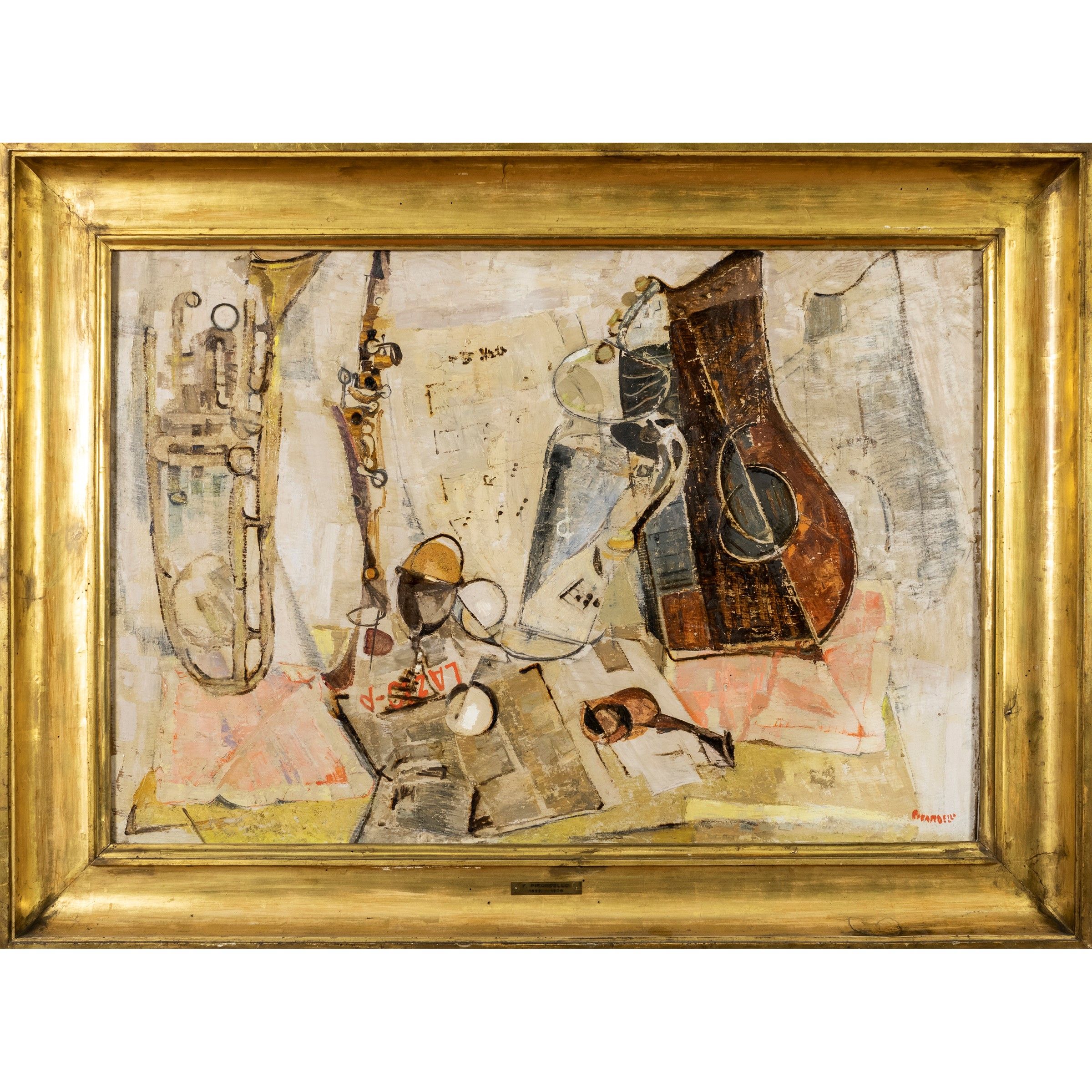 Roma 1899 - 1975 Colazione e musica n° 5, 1952 circa, olio su cartone, firmato in basso a destra, firmato e titolato sul retro, entro cornice.