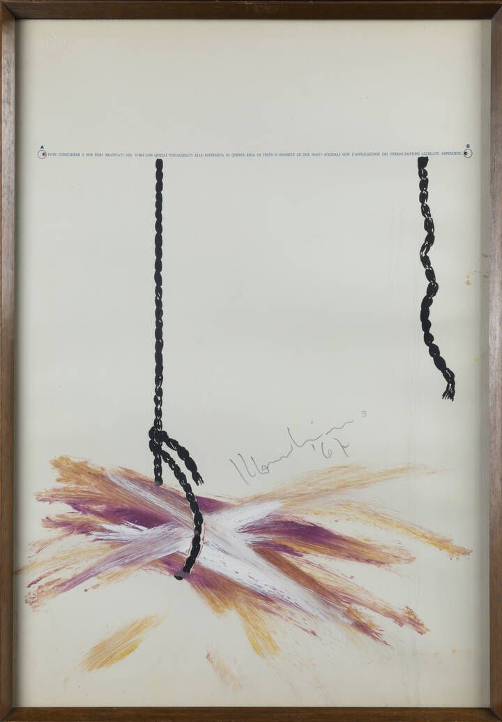 ALDO MONDINO Torino 1938 - 2005 Senza titolo 1967 (dalla serie delle Cadute) 68x47 serigrafia ritoccata con disegno su carta Opera firmata e datata a mezza altezza verso destra con n. 3 dopo la firma In alto reca la scritta a stampa in stampatello: Fate coincidere i due fori praticati nel tubo con quelli visualizzati all'estremità di questa riga di testo e rendete le due parti solidali con l'applicazione dei fermacampioni allegati. Appendete In alto a sinistra timbro a secco ED912 Tubo mancante Cfr. Catalogo Generale, Allemandi, Torino, p. 177