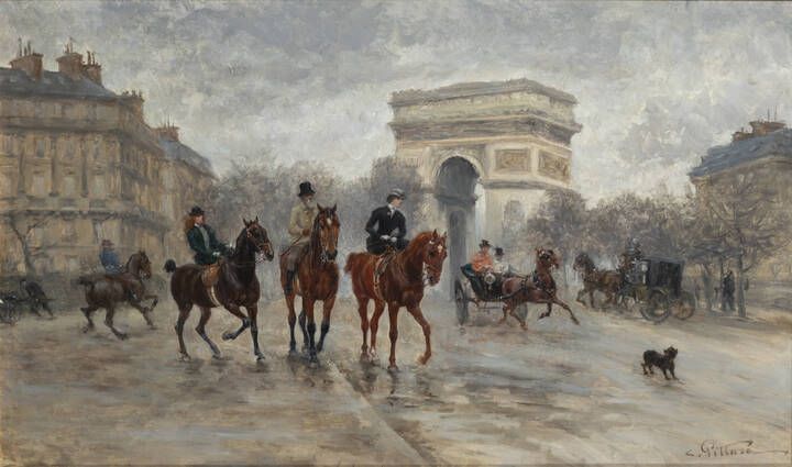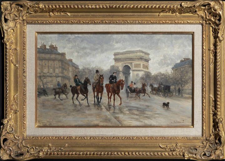 CARLO PITTARA Torino 1836 - 1890 Rivara (TO) Scena parigina 1885 24,5x40 olio su tavola Opera firmata in basso a destra Già collezione architetto Giuseppe Luigi Marini, Torino Dichiarazione di vendita dell'architetto Giuseppe Luigi Marini rilasciata a Torino il 23 ottobre 1991