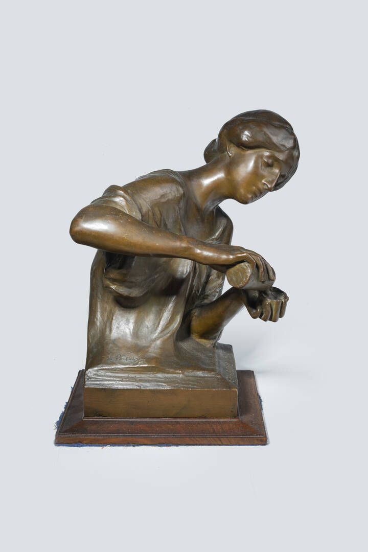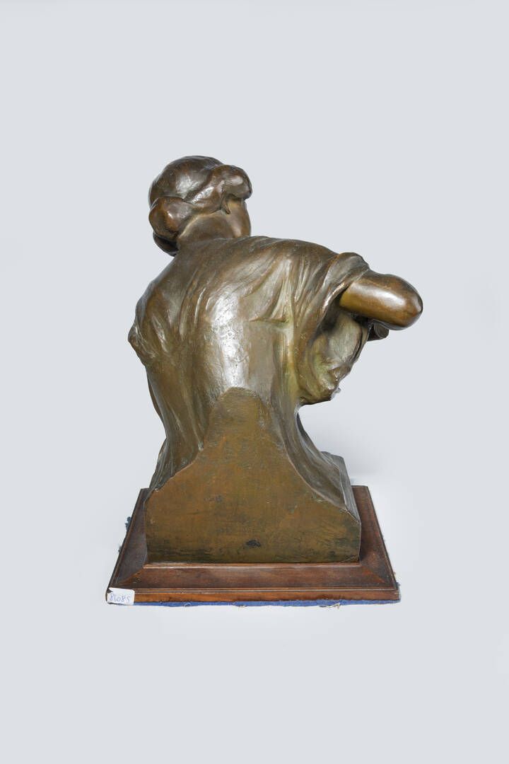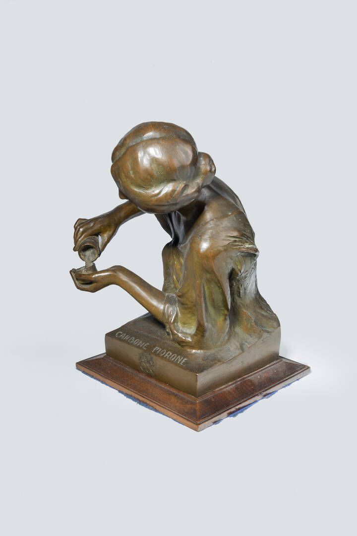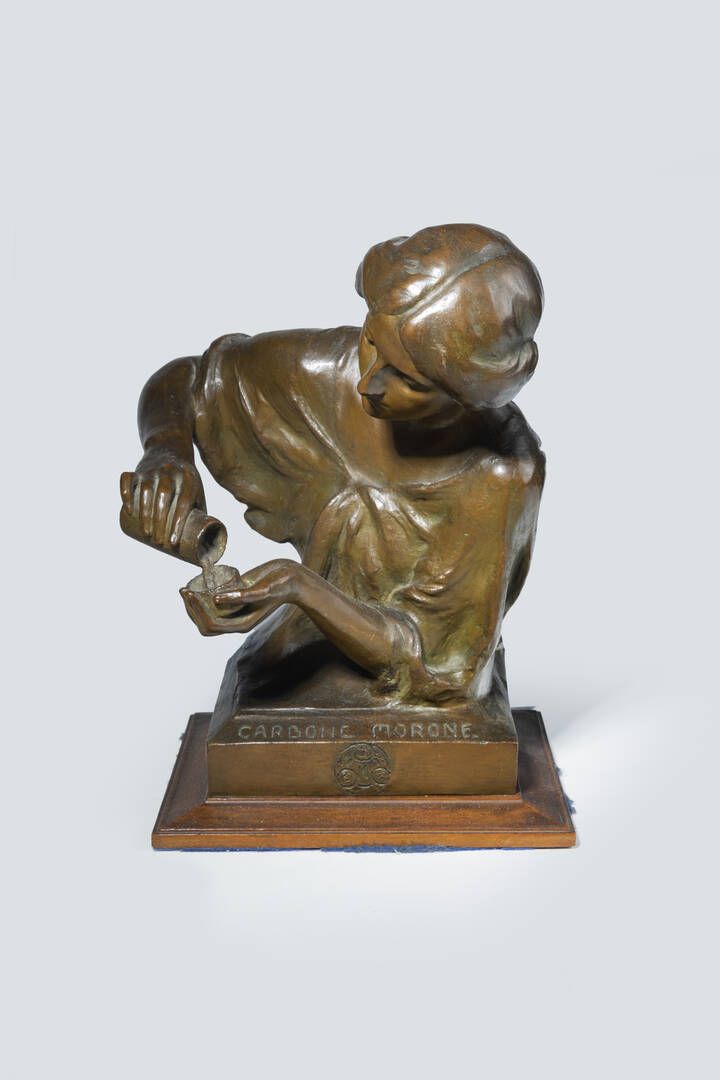 CESARE BISCARRA Torino 1866 - 1943 Mezzobusto femminile H. cm 31,5x27x23 scultura in bronzo su base in legno Opera firmata in basso a sinistra Al fronte reca la scritta in stampatello Carbone-Morone. Pubblicità per la farmacia Morone, corso Duca di Genova angolo via Gioberti, Torino, produttore G.B. Schiapparelli e figli, vedi come da pubblicità su La Stampa, giugno 1905