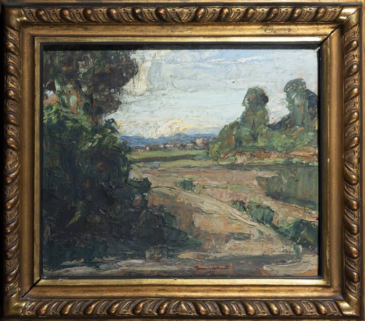 DOMENICO VALINOTTI Torino 1899 - 1962 Il greto 1921 28,5x35 olio su tavoletta Opera firmata e datata in basso al centro e al retro con titolo Firma e data al fronte riprese di recente Partecipazione alla Primaverile fiorentina del 1922 (scritta al retro)