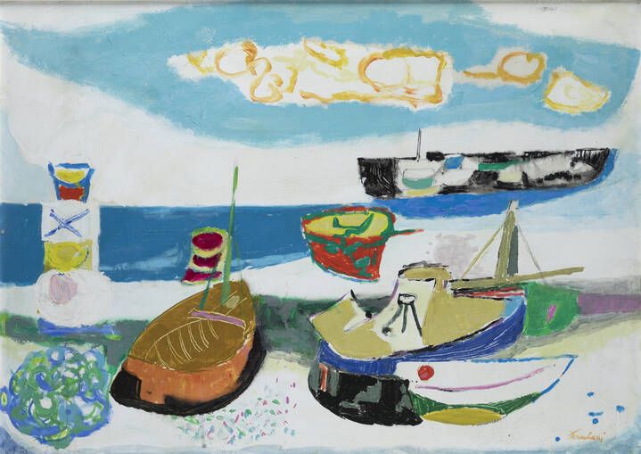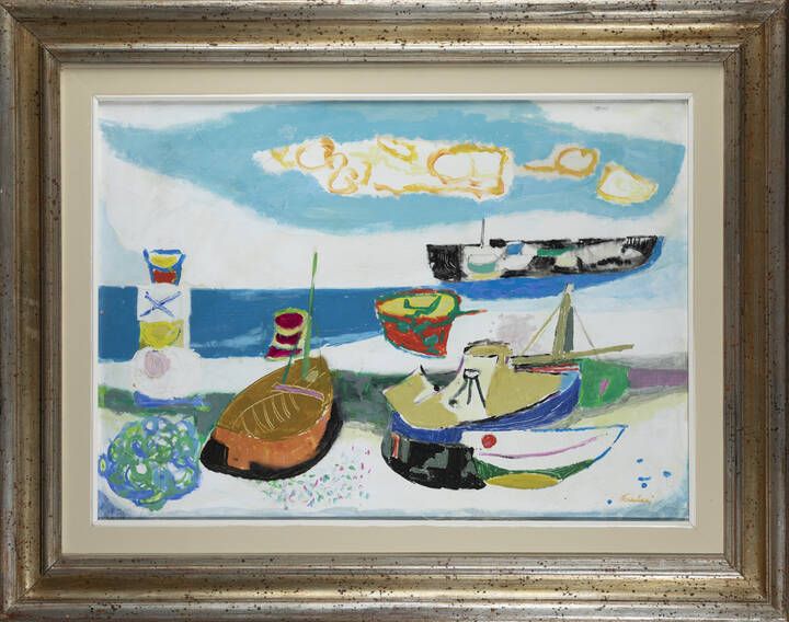 ENRICO PAULUCCI Genova 1901 - 1999 Torino Spiaggia 1967 50x70 olio su tela Opera firmata in basso a destra e al retro con titolo Opera registrata presso l'Archivio delle Opere di Enrico Paulucci con il n. 0924, in data 31 marzo 1995 (autentica su fotografia con firma dell'artista e indicazione di provenienza da Galleria Santa Croce, Firenze, Galleria Silvana, Montecatini Terme e collezione privata Masetti, Pistoia)