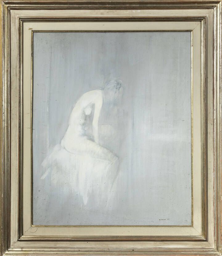 GIUSEPPE AJMONE Carpignano Sesia (NO) 1923 - 2005 Romagnano Sesia (NO) Riflessione 1969 73,5x60 olio su tela Opera firmata e datata in basso a destra e al retro con titolo Già Galleria Annunciata, Milano (etichetta al retro) Già Galleria D'arte Sianesi, MIlano (etichetta al retro) Esp.: -2013, 23 novembre-15 dicembre, Vercelli, Casa d'Arte Viadeimercati Voglia di Ottocento, ripr. a pag. s.n.
