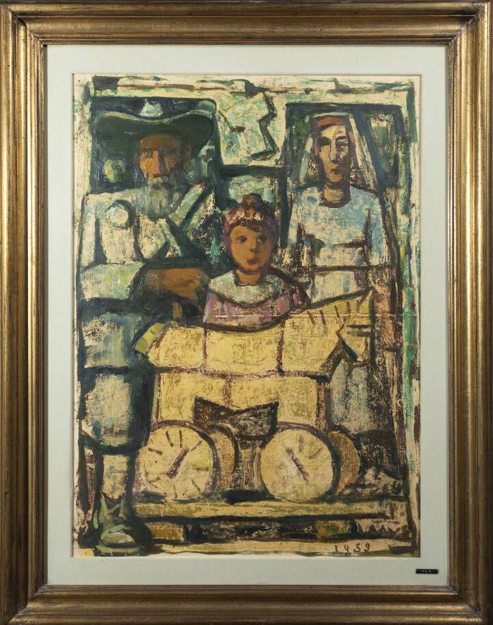 ITALO MUS Chatillon (AO) 1892 - 1967 St.Vincent (AO) La famiglia della guida 1959 72x52 tecnica mista su carta incollata su tela fissata su tavola di recupero Opera firmata e datata in basso a destra 1959 e al retro 1952 con titolo Esp.: - 1966, ottobre, Torino, Società Promotrice delle Belle Arti, Antologica di Italo Mus (etichetta al retro) - 2009, 12 marzo/4 aprile, Torino, Galleria La Conchiglia, Realtà quotidiane (etichetta al retro)
