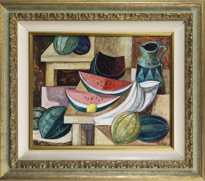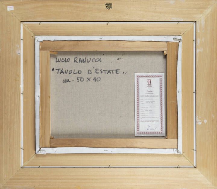 LUCIO RANUCCI Perledo (LC) 1925-2017 Tavolo d'estate 40x50 acrilici su tela Opera firmata in basso a destra e al retro con titolo Al retro certificato di autenticità della Galleria Angolare, Milano, Genova, Rapallo (etichetta al retro con n. 856893) Autentica della Galleria Angolare, Milano, Genova, Rapallo, rilasciata a Milano nel gennaio 1991