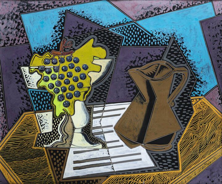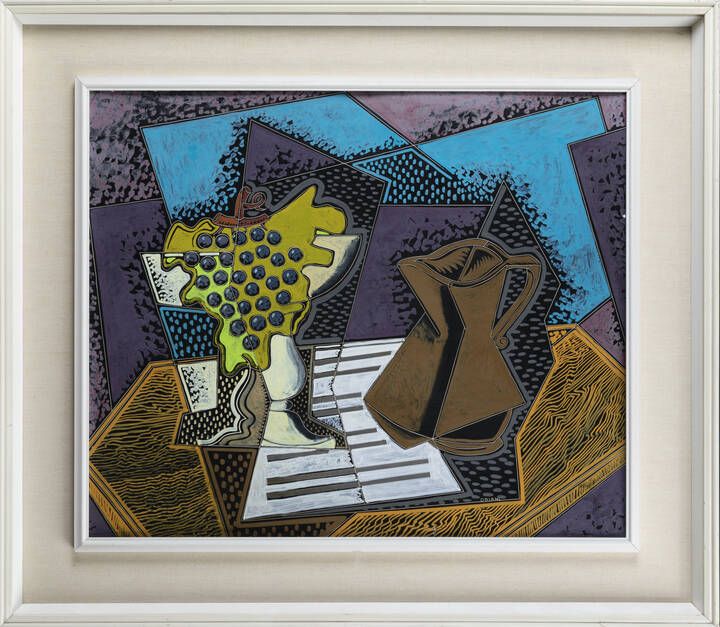 PIPPO ORIANI Torino 1909 - 1972 Roma Natura morta con brocca e uva 1960/65 50x64 encausto e grafito su cartone gessato Opera firmata in basso a destra e al retro per autentica con titolo e tecnica Certificato con fotografia della Fondation Oriani, Ontario, Canada con n. FPO/MV 1273*