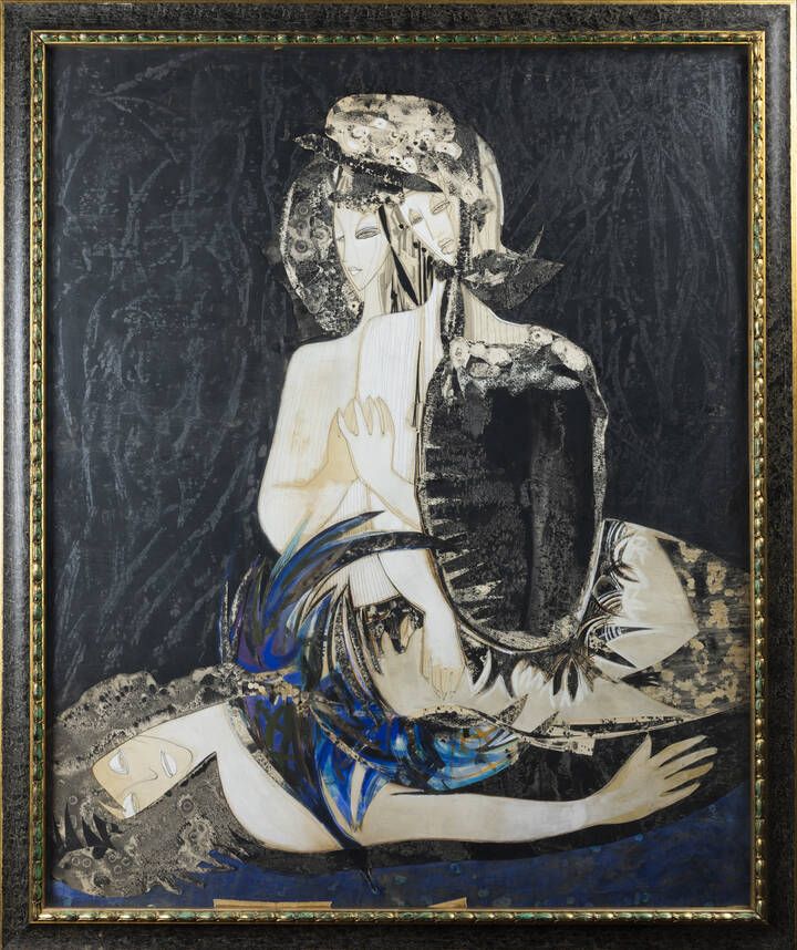 PONTE CORVO (Raffaele Pontecorvo) Roma 1910 - 1983 Torino L'isola delle tre donne 1961 120x98 tempera e collage su carta applicata su cartone pressato Opera firmata, datata e intitolata in basso a sinistra Già Galleria d'Arte Botero, Torino (etichetta al retro) Già Galleria d'Arte Piemonte Artistico e Culturale, Torino (timbro al retro) Già Galleria d'Arte Vinciana, Milano (timbro al retro) Già Galleria privata, Torino (etichetta manoscritta al retro)