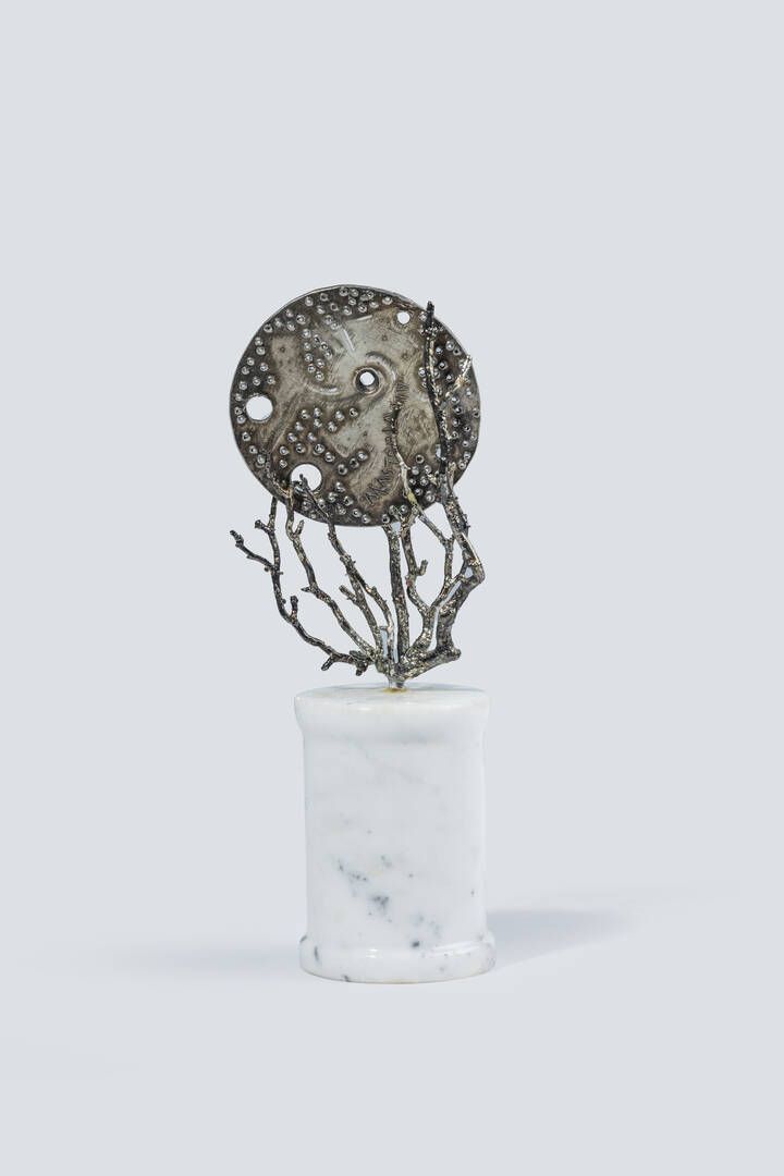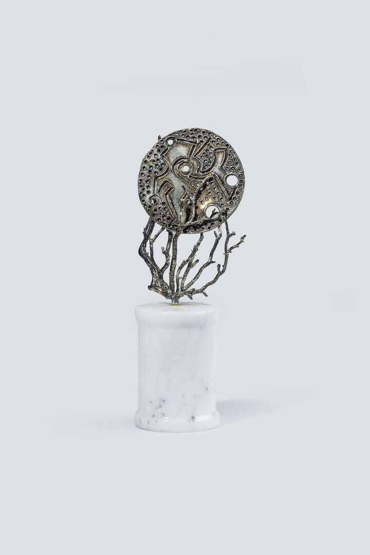 UMBERTO MASTROIANNI Fontana Liri (FR) 1910 - 1998 Marino (Roma) Senza titolo H. cm 11 scultura in argento a forma di ramificazione che contiene un elemento rotondo estraibile, inciso e sbalzato su entrambe le facce. la scultura in argento è su base in marmo bianco di forma cilindrica. Altezza complessiva cm 18 Autentica dell'artista su fotografia