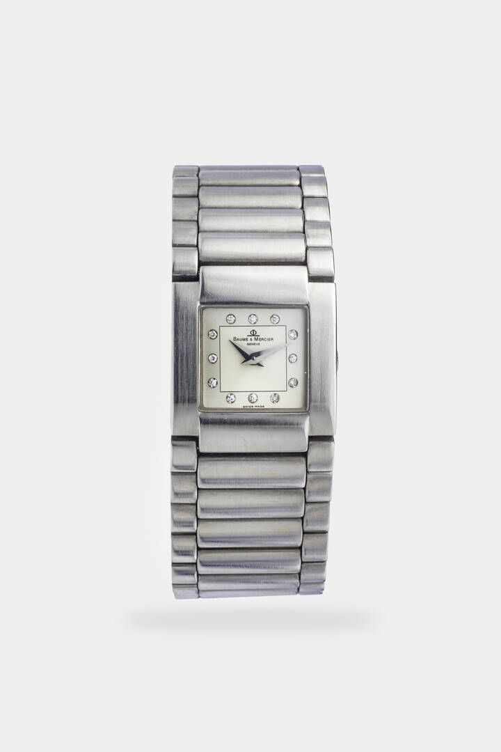 Cassa in acciaio con fondello a pressione. Quadrante argento con piccoli diamantini ad indicare le ore. Bracciale in acciaio integrato con chiusura a scomparsa.