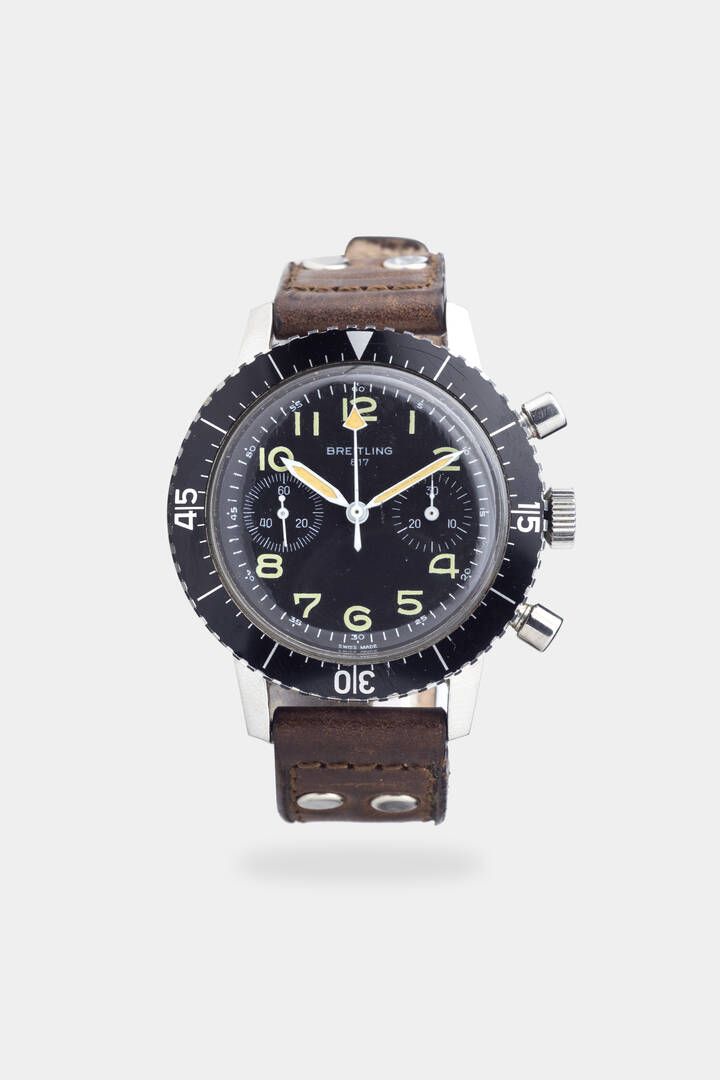 BREITLING Mod. , Ref.. 817, anno 1975 circa Diam. 39,5 mm Cassa in acciaio con fondello a vite. lunetta bidirezionale nera. Quadrante nero effetto Matte con numeri arabi luminescenti. indicazione secondi continui al 9 e dei 30 minuti al 3. Movimento a carica manuale cal.236. Rarissimo cronografo militare commissionato per i Carabinieri della Folgore, esemplare 500/500. In ottimo stato di conservazione.
