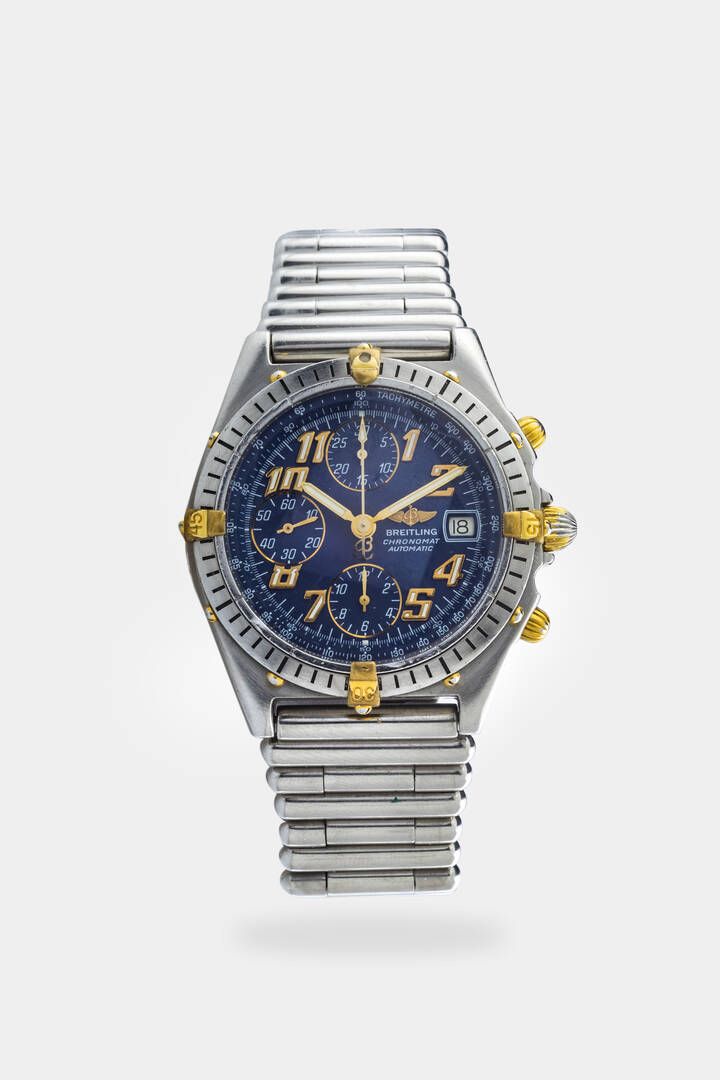BREITLING Mod. Chronomat, ref.B13047, anni 2000 Diam. 39 mm Cassa in acciaio con lunetta girevole e fondello a vite. Quadrante blu con numeri arabi luminescenti applicati, contatore dei 30 minuti al 12, dei secondi continui al 9, delle 12 ore al 6 e datario al 3. Bracciale in acciaio originale integrato con chiusura a scomparsa. Movimento a carica automatica Valjoux cal 7750.