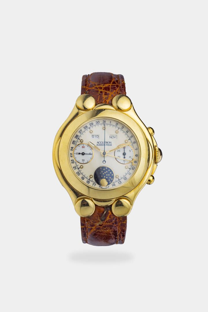 BULOVA Mod. Accutron Marco Polo, ref.11979-1, anni '90 Diam. 40 mm Cassa in oro, di forma, con fondello a scatto. Quadrante beige con indici geometrici applicati, secondi continui al 9, 30 minuti al 3, fasi lunari al 6 e datario serigrafato ai limiti del quadrante. Movimento a carica manuale cal.7734.