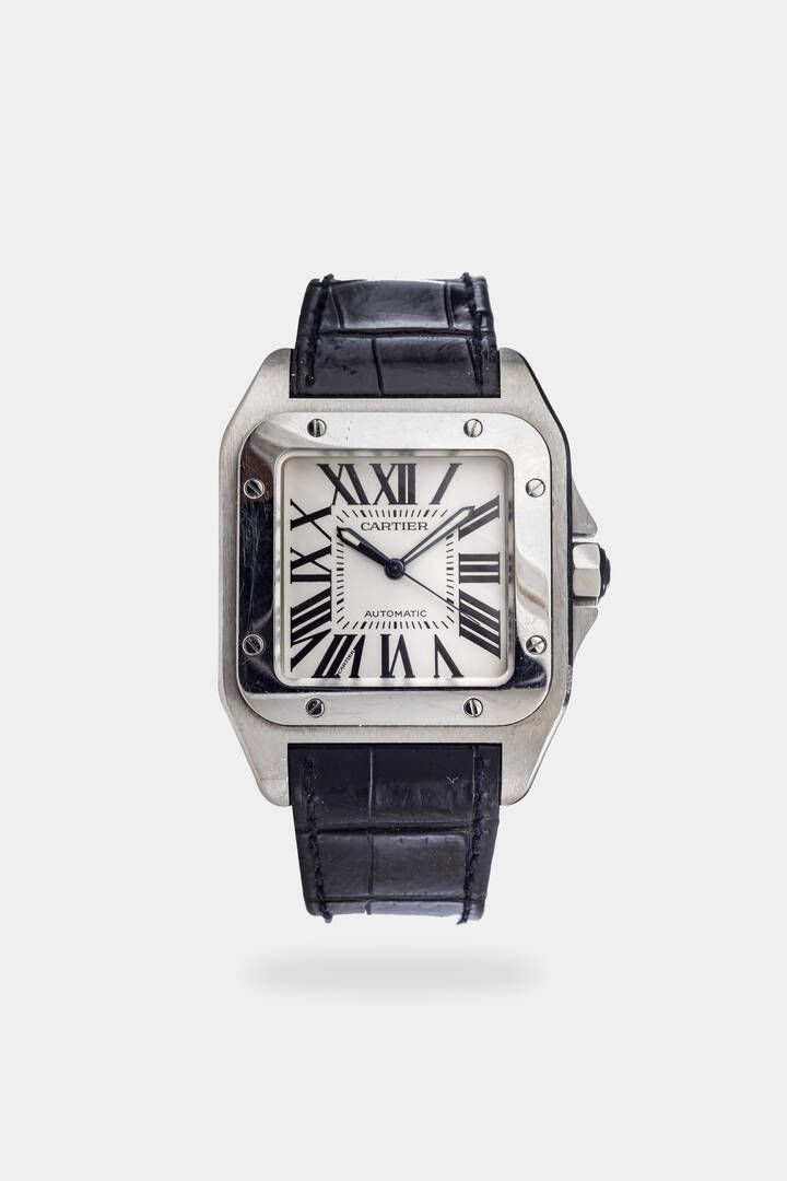CARTIER Mod. Santos 100 XL, ref. 2656, anno 2005 38x51mm Cassa in acciaio e lunetta lucida avvitata. Quadrante argento con numeri romani e minuteria a binario chiusa serigrafata. Bracciale in pelle con chiusura in acciaio a scatto. Movimento a carica automatica cal.049. Orologio corredato di garanzia italiana ,box, controscatola e libretti.