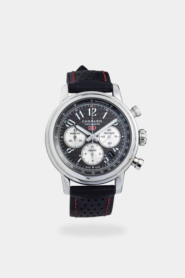 CHOPARD Mod. Mille Miglia, ref.8589, serie recente Diam. 42 mm Cassa in acciaio con tasti a ombrello della cronografia e fondello trasparente. Quadrante effetto acciaio spazzolato con numeri arabi luminescenti e datario al 5. Al 3 presente sub-contatore dei secondi continui, al 6 delle 12 ore ed al 9 dei 30 minuti. Movimento a carica automatica cal.2894. In perfette condizioni completo di box, garanzia e libretti.