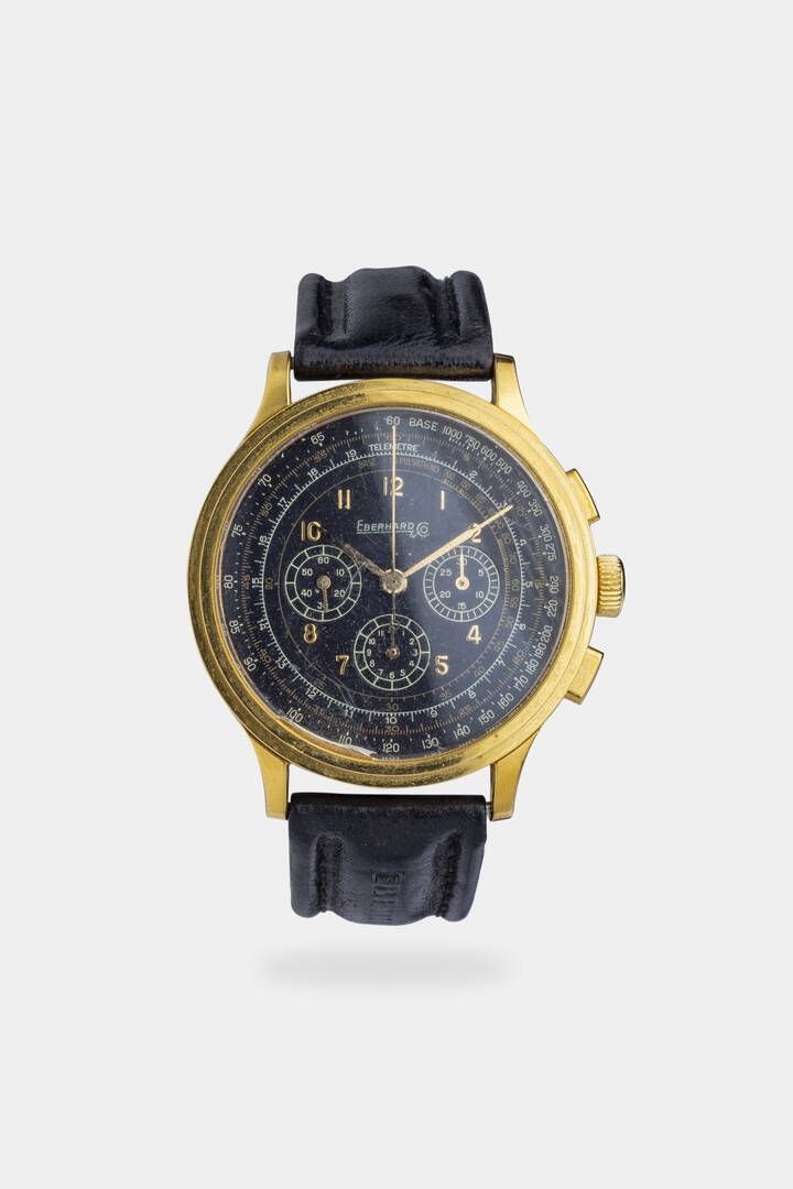 EBERHARD Mod. Magie Noire, ref.34006, anno 1993 Diam. 40 mm Cassa placcata con fondello a pressione in acciaio. Quadrante nero con numeri arabi applicati, indicazione dei secondi continui al 9, dei 30 minuti al 3 e delle 12 ore al 6. Ai limiti del quadrante troviamo scala tachimetrica, pulsazioni e scala telemetrica serigrafate. Movimento a carica manuale Lemania. Orologio completo di scatola e garanzia. Vetro con rottura ad ore 7.
