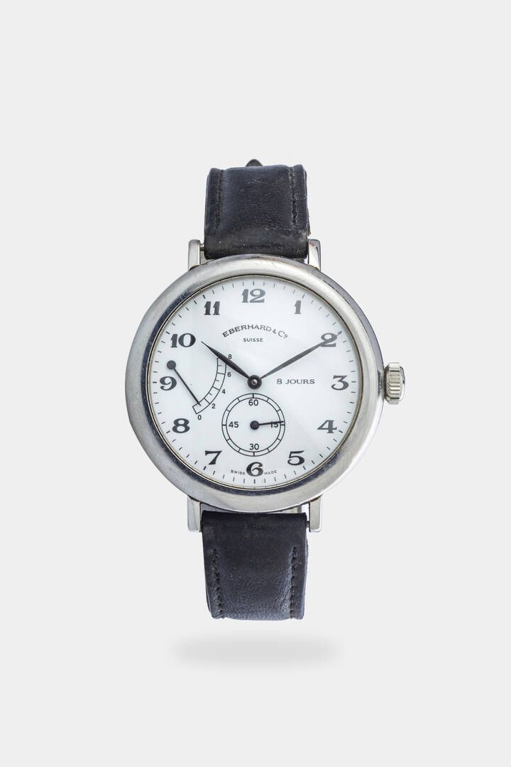 EBERHARD Mod. 8 Jours, ref.21017, anni 2000 Diam. 40 mm Cassa in acciaio con fondello avvitato. Quadrante bianco con numeri arabi serigrafati, indicazione dei secondi continui al 6 ed indicazione degli 8 giorni di riserva di carica al 9. Movimento a carica manuale.