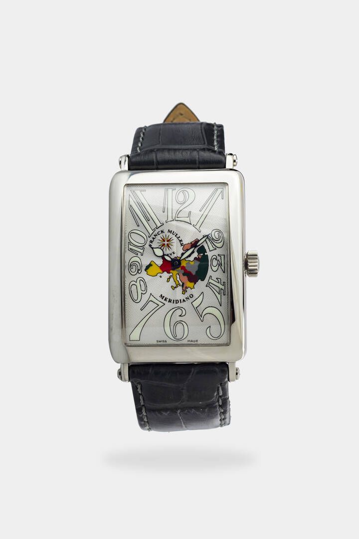 FRANCK MULLER Mod. Long Island Meridiano, ref.1000SC 43x31 mm Cassa curva in acciaio con tipica forma rettangolare. Quadrante con numeri arabi luminescenti e iconografia dell'Europa smaltata al centro. Movimento a carica automatica cal.2800R Serie limitata e numerata di 100 esemplari. Ottimo stato di conservazione, completo di box in legno, garanzia originale e controscatola.