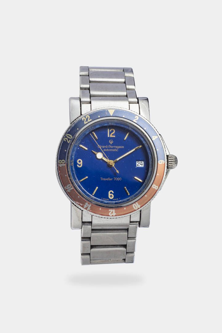 GIRARD PERREGAUX Mod. Traveller, ref.7000, anni '90 Diam. 38 mm Cassa in acciaio con fondello avvitato e lunetta bicolore blu-rossa. Quadrante blu con numeri arabi ai quarti e indici geometrici applicati. Presenza del datario al 3 e indicazione dei secondi continui al centro. Bracciale in acciaio con chiusura a scomparsa. Movimento a carica automatica.