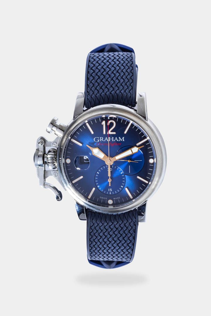 GRAHAM Mod. Cronofighter, ref.GR2FYGV, serie recente, per mancini. Diam. 47 mm Cassa in acciaio con fondello a vitreo a vite. Caratteristico sistema per l'avvio e il reset della cronografia. Quadrante blu con indici geometrici applicati. secondi continui al 3. 30 minuti al 6 e datario al 9. Movimento a carica automatica cal.069. Corredato di scatola. controscatola e garanzia. Orologio in stato di nos.