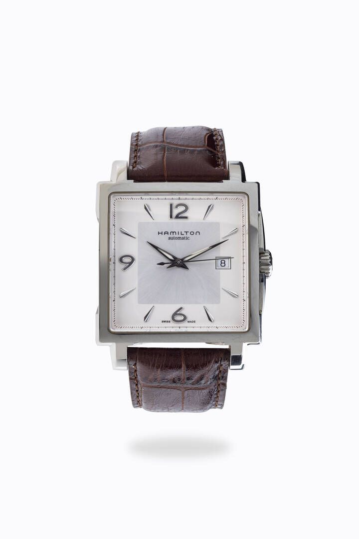 HAMILTON Mod. Jazzmaster, serie recente 39x39mm Cassa in acciaio, di forma quadrata, con fondello a vista. Quadrante argento bitonale con numeri ai quarti ed indici applicati. Indicazione centrale dei secondi continui e datario al 3. Movimento a carica automatica 2824. Completo di box, garanzia e libretti.