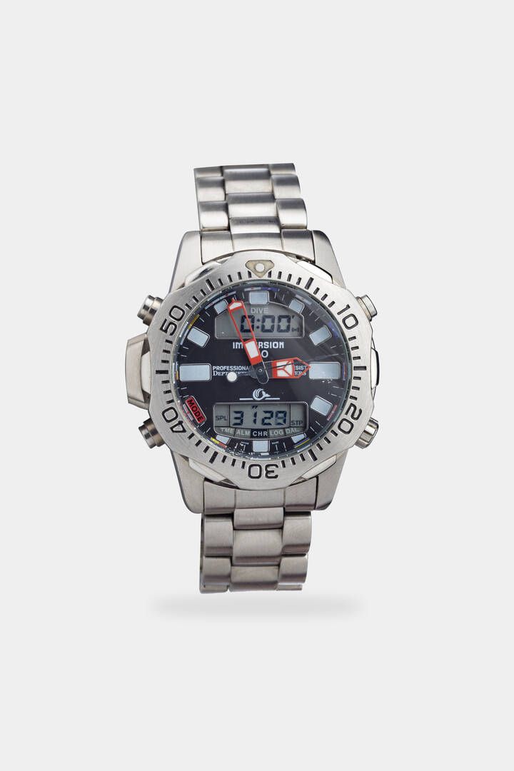 IMMERSION Mod. Diver, serie recente Diam. 42 mm Cassa in acciaio con lunetta girevole monodirezionale. Quadrante antracite con indici geometrici applicati. Presenti due schermi digitali ad ore 12 ed al 6 per le funzioni extra come allarme, profondimetro etc. Bracciale in acciaio integrato con chiusura clasp. Movimento al Quarzo.