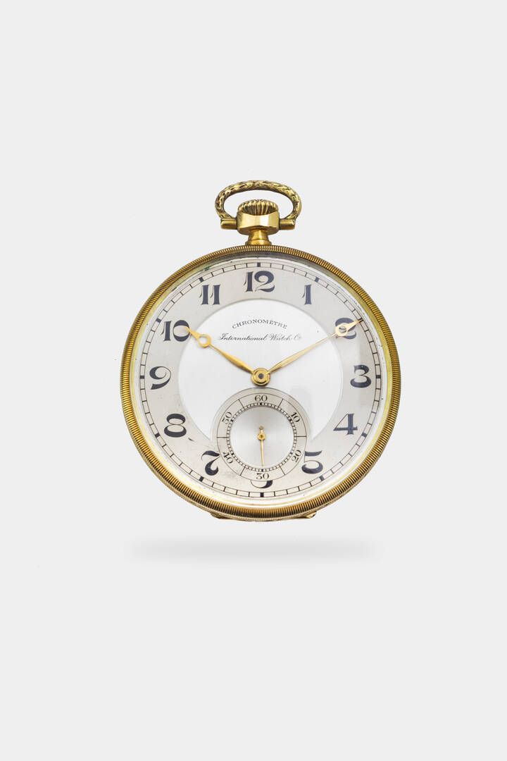INTERNATIONAL WATCH Mod. Pocket Watch, anno 1920 Diam. 48 mm Cassa in oro con fondello a scatto. cuvette in metallo. Quadrante bitonale argento con numeri Breguet serigrafati ed indicazione dei secondi continui al 6. Movimento a carica manuale. Non funzionante.