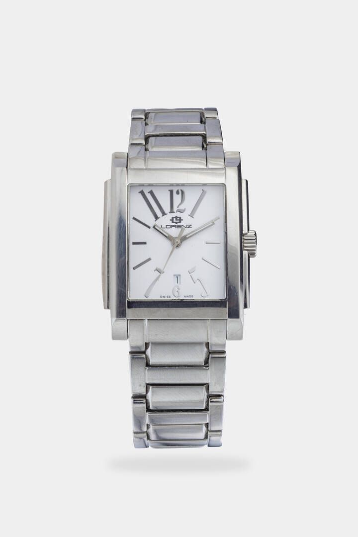 Cassa in acciaio, di forma. Quadrante bianco con numeri arabi applicati e datario al 6.