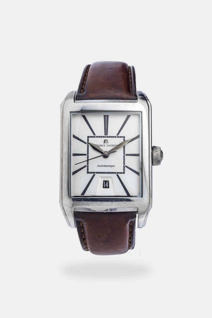 Cassa di forma, in acciaio, con fondello in vetro. Quadrante argento con indici e minuteria a binario serigrafati. Datario al 6.