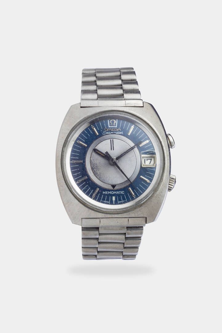 OMEGA Mod. Seamaster Memomatic, ref.166072, anni' 70 Diam. 40 mm Cassa in acciaio con fondello a vite e doppia corona. Quadrante bitonale argento-blu con doppio disco centrale girevole e datario al 3 (quadrante molto raro) Bracciale in acciaio Omega integrato ref.1170 con chiusura Clasp. Movimento a carica automatica cal.980. Da revisionare.
