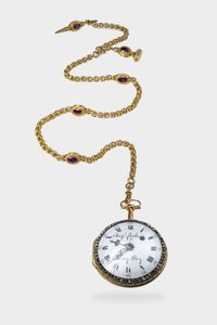 VOISIN A PARIS Orologio da tasca, a ribaltina, XIX secolo Diam. mm Cassa in oro rosa 9 Kt con catena. Quadrante [..]