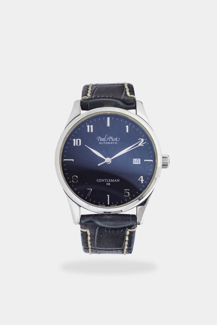 PAUL PICOT Mod. Gentleman, ref.4103, anni 2000 Diam. 38 mm Cassa in acciaio con fondello a pressione. Quadrante antracite con numeri arabi applicati, indicazione dei secondi continui al centro e datario al 3. Movimento a carica automatica. Completo di box e certificato.