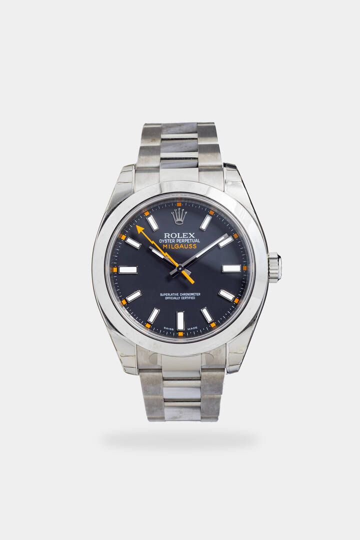 ROLEX Mod. Milgauss, ref.116400, anno 2009 Diam. 40 mm Cassa in acciaio antimagnetica con fondello a vite. Quadrante nero con indici luminescenti applicati e tipica lancetta dei secondi centrali raffigurante una saetta arancione. Bracciale in acciaio Oyster con chiusura clasp. Movimento cal.3131 Orologio nuovo completamente pellicolato completo di scatola, controscatola, tag, libretti e garanzia card italiana.