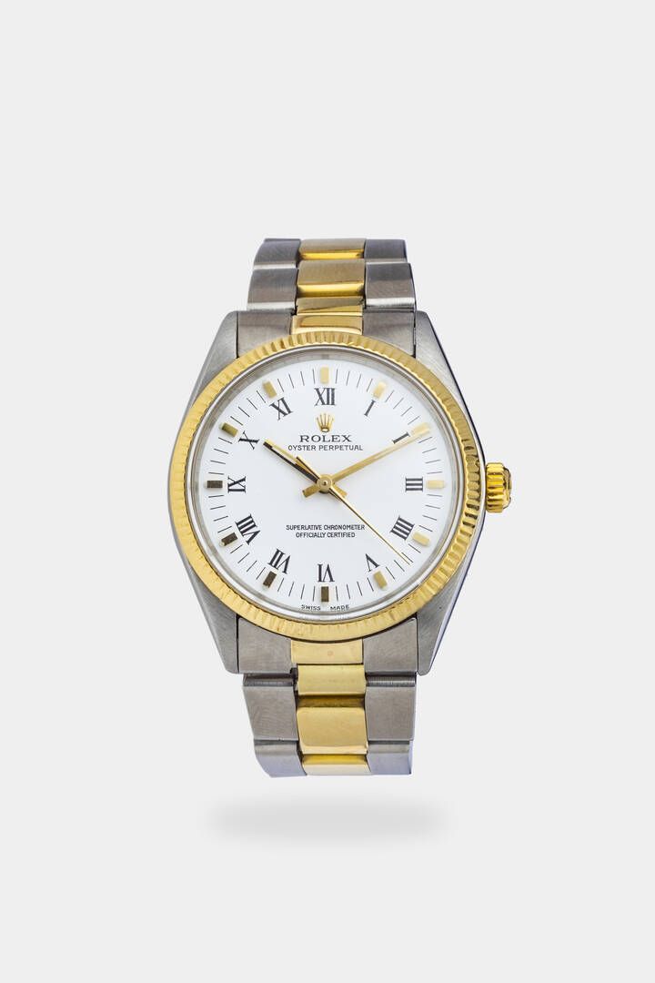 ROLEX Mod. Oyster Perpetual, ref.1005, anno 1977 Diam. 34 mm Cassa in acciaio con fondello a vite e lunetta in oro godronata. Quadrante bianco con numeri romani serigrafati ed indici geometrici applicati. Bracciale in acciaio e oro integrato con chiusura Clasp. Movimento a carica automatica.
