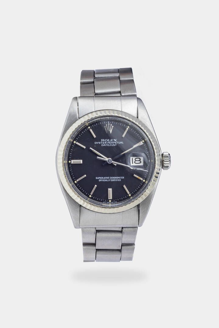 ROLEX Mod. Datejust, ref.1601, anno 1974 Diam.36 mm Cassa in acciaio con lunetta godronata in oro bianco. Quadrante nero Pie-Pan sigma con indici geometrici applicati, indicazione dei secondi continui al centro e della data al 3. Bracciale Oyster ripiegato con chiusura Clasp. Movimento a carica automatica cal. 1570. Completo di box e due maglie aggiuntive.