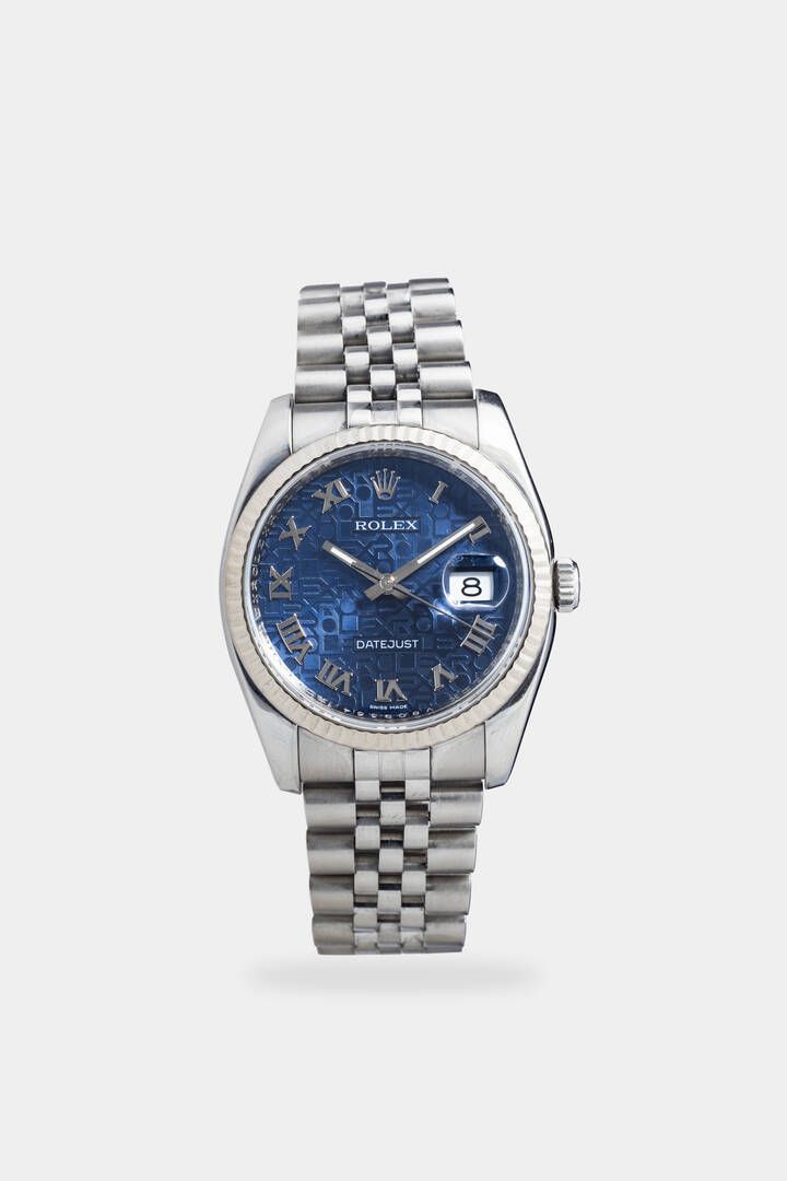 ROLEX Mod. Datejust , ref.116234, anno 2009 Diam. 36 mm Cassa in acciaio con lunetta godronata in oro bianco. Quadrante blu con numeri romani applicati, datario al 3 ed indicazione dei secondi continui al centro. Bracciale in acciaio Jubilee con chiusura a scomparsa. Movimento a carica automatica cal.3135.