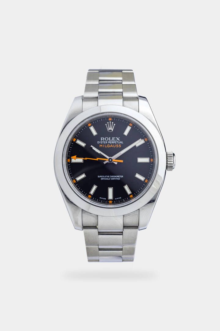ROLEX Mod. Milgauss, ref.116400, anno 2007 Diam. 40 mm Cassa in acciaio antimagnetica con fondello a vite. Quadrante nero con indici luminescenti applicati e tipica lancetta dei secondi centrali raffigurante una saetta arancione. Bracciale in acciaio Oyster con chiusura Clasp. Movimento automatico cal.3131. Completo di scatola, controscatola, libretti, una maglia aggiuntiva e certificato del rivenditore.