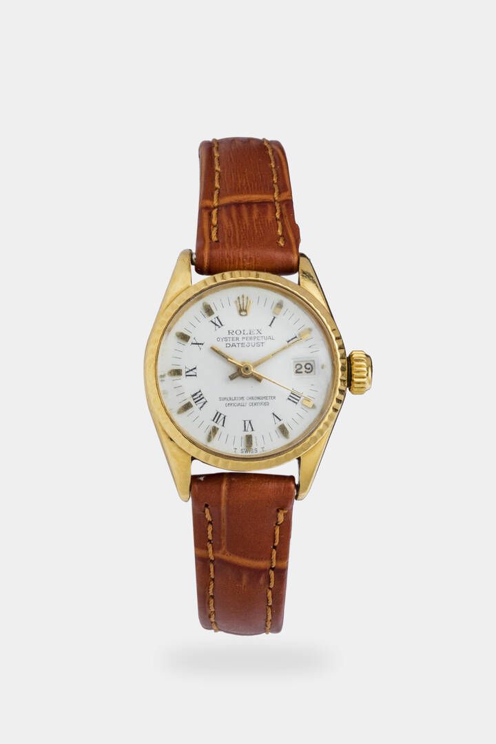 Cassa in oro con lunetta godronata. Quadrante bianco con indici geometrici applicati e datario al 3.