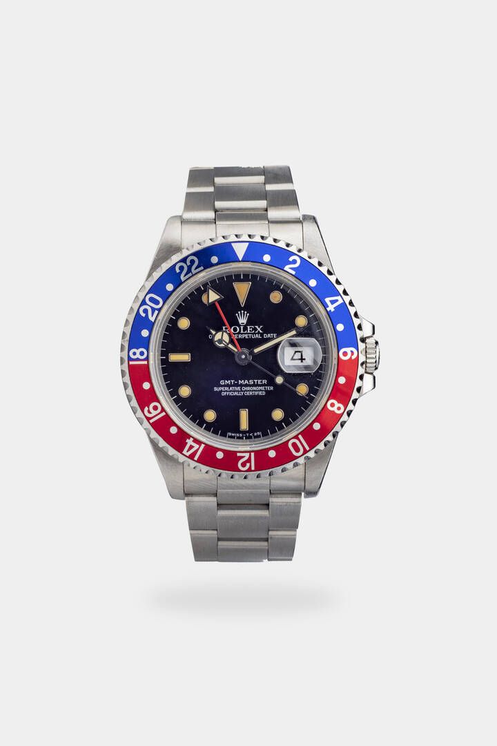 ROLEX Mod. GMT Master. ref.16700, anno 1992 Diam. 40 mm Cassa Oyster in acciaio con fondello a vite e lunetta girevole bicolore blu\rossa. Quadrante nero con indici geometrici luminescenti applicati. Presente il datario al 3 ed una seconda lancetta indicante un altro fuso orario. Bracciale Jubilee integrato con finali 555. Movimento a carica automatica cal.3175. Orologio mai lucidato.