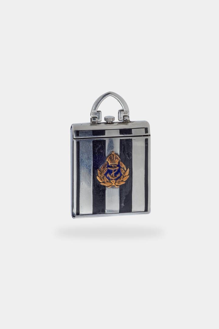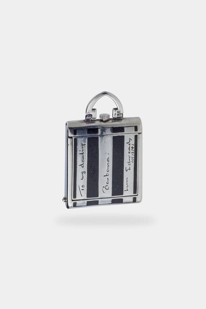 ROLEX Orologio da tasca con possibilità di essere utilizzato come sveglia da tavolo. 30x37 mm Cassa di forma, in argento, con decori a righe in smalto nero. Quadrante argento con numeri arabi luminescenti e minuteria serigrafata. Movimento a carica manuale. Corredato da scatola dell'epoca.