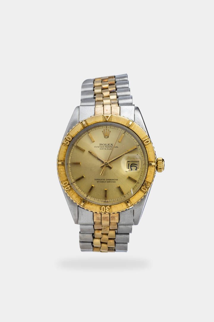 ROLEX Mod. Turn-O-Graph, ref.1625, anno 1968 Diam. 36 mm Cassa in acciaio con lunetta girevole graduata da permettere la misurazione di un determinato periodo di tempo. fondello a vite. Quadrante champagne con indici geometrici applicati, datario al 3 ed indicazione centrale dei secondi continui. Bracciale Jubilee ref.6251H. Movimento a carica automatica cal.1570.